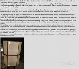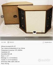 Cello Amati by Mark Levinson e AR LST doppie con stand,cavi,imballi.Diffusori mitici ed iconici da me preferiti per la grande descrittivita' e dettaglio.Grazie ai 18 trasduttori per lato offrono dettaglio superiore ad altri competitors .Cello a 10kEU e AR LST a 5kEU.