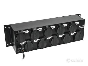 N.B. Non è una centralina vera e propria. Non ha programmi impostati, non ha funzionalità particolari. E' solamente una comoda pulsantiera ciabatta elettrica concepita per essere inserita facilmente nei flight cases.