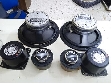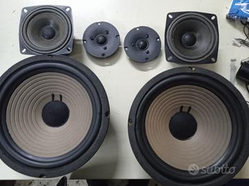 Vendo,Come da foto,Kit per audiocostruzioni/ricambi 3 vie otre 150 watt 8 ohm HIFI Ciare,Composto da coppia Woofer(ribordati) da 25cm+coppia Midrange(ribordati) da 13cm+coppia Tweeter da 10cm, tutti funzionanti.NB:un woofer presenta un piccolissimo taglietto sul foam cui non ne pregiudica assolutamente la resa sonora.Le foto sono parte integrante dei componenti.SPEDIZIONE PREVIO ACCORDO.