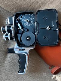 Bellissima cinepresa vintage anni ‘60 in condizioni eccellenti. Modello D8L con torretta a tre obiettivi. La Roll Roice delle cineprese 8mm dell’epoca, costruita in Svizzera utilizzando maestranze di altissima perizia artigianale. Perfettamente funzionante e tenuta con cura estrema. Corredo: cinepresa con tre obiettivi, borsa in pelle con tracolla, libretto istruzioni e manuale d’uso.
