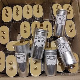 Vendo lotto di condensatori ITALFARAD nuovi, di altissima qualità in polipropilene, per impieghi speciali, ALTISSIMA TENSIONE E CORRENTE, dove prestazioni e affidabilità devono essere ai massimi livelli, realizzati su specifiche da Italfarad, nuovi ad esclusione di 6 pezzi provati qualche ora per demo, di eccellente qualità e fattura, terminali a vite con rondelle e dadi tutti in ottone, per strumenti e apparecchi top, pensati per crossover di diffusori professionali da migliaia di watt e per l’hi-fi/hi-end. Ore di funzionamento in utilzzo musicale praticamente infinite. Attenzione! Dimensioni e pesi importanti! NON SONO I “SOLITI” CONDENSATORI DA RIFASAMENTO, SONO PRODOTTI MOLTO PIU’ PERFORMANTI. composto da: 3uF/450VAC/850VCC 6 pezzi dimensioni diametro 55x85mm 5uF/630VAC/1500VCC 6 pezzi dimensioni 47x90x105mm ovali 7,5uF/630VAC/1500VCC 6 pezzi dimensioni 47x90x105mm ovali 10uF/550VAC/1200VCC 6 pezzi dimensioni 47x90x105mm ovali 15uF/450VAC/850VCC 4 pezzi dimensioni 47x90x105mm ovali 20uF/450VAC/850VCC 6 pezzi dimensioni 47x90x105mm ovali 25uF/450VAC/850VCC 6 pezzi dimensioni 47x90x130mm ovali 33uF/450VAC/850VCC 6 pezzi dimensioni 47x90x130mm ovali 50 uF/330VAC/600VCC 6 pezzi dimensioni 47x90x130mm ovali 75uF/250VAC/450VCC 4 pezzi dimensioni 47x90x130mm ovali 100uF/250VAC/450VCC 6 pezzi dimensioni 47x90x130mm ovali 150uF/330VAC/600VCC 2 pezzi dimensioni diametro 85x185mm 330uF/250VAC/450VCC 2 pezzi dimensioni diametro 75x235mm Le dimensioni si riferiscono al solo corpo, escluse viti e terminali. Rivenduti singolarmente o a coppie valgono almeno il doppio. NO SCAMBIO. VENDO PER REALIZZO. PAGAMENTO CONTANTI ALLA CONSEGNA o bonifico anticipato in caso di spedizione.La spedizione è sconsigliata e costosa causa PESO dell'oggetto, ma disponibile. Grazie ai soliti "furbi", RESI NON ACCETTATI