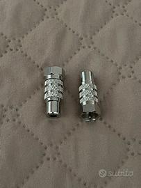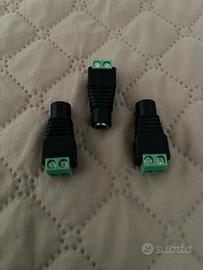 Vendo in blocco vari connettori per il collegamento CCTV per apparecchi di video sorveglianza. Comprende n.4 connettori video balun passivo per collegamenti sistevi dí video sorveglianza e per trasmissione segnale cavi rete UTP come il Cat5 o superiore (come da foto n1 e foto n2), N.3 adattatori per cavo femmina con connettore jack di alimentazione da 12 V per collegamento dispositivi di video sorveglianza ed anche per luci a led (foto n3), N.2 connettori F Twist-on per cavi coassiali e per CCTV (foto n4), N.2 adattatori F presa F con presa BNC per CCTV (foto n5), N.2 adattatori di accoppiamento da BNC maschio a BNC maschio connettori BNC (bayonet neill-concelman) per TV CCTV camera. Prodotti nuovi. Vendo solo in blocco.
