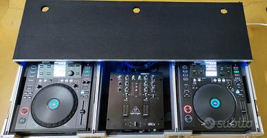 Console per DJ professionale completa, composta da 2 lettori Gemini CDJ-700 collegati tramite cavi RCA placcati oro Cordial a 1 mixer da DJ Behringer NOX101 a 2 canali, contenuti in un flight case Magma modificato con strisce a LED blu elettrico e rispettivo alimentatore.