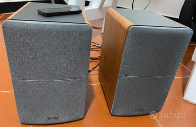 2 casse da studio Edifier R1280T altoparlanti + telecomando.1 microfono Tonor dinamico con cavo XLR da 5 metri.1 laser con treppiede con luce verde.1 borsa con 3 ciabatte nuove e 2 cavi+ 3 cavi rca.1 paio di cuffie.