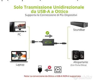 Convertitore digitale audio video da USB A a SPDIF 96 kHZ lunghezza 2 m ( 1m di cavo USB+1 m di cavo ottico) per PC Mac e Laptop. No compatibile per TV e No per console giochi.