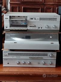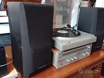 Funzionante e in buone condizioni. Segnalo la pellicola che riveste i diffusori si sta staccando; a parte questo i diffusori sono perfettamente funzionanti. Completo di cavi. Il registratore a cassette viene dato in omaggio ma non funziona: va avanti e indietro veloce, a fatica, ma in play mangia il nastro quindi è da riparare. La radio e l'amplificatore funzionano bene, il giradischi ha ancora la sua puntina originale ma è in buone condizioni e si sente bene. Il costo della spedizione è calcolato su 3 colli (1x casse; 1x giradischi; 1 per il resto), preferibile il ritiro a mano Vendita tra privati senza garanzia ne restituzione