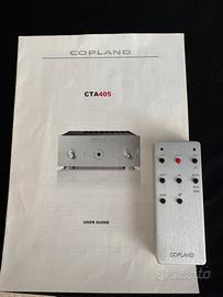 Vendo Copland CTA405A, amplificatore integrato con valvole KT120, completo di telecomando originale e manuale d’uso. Caratteristiche principali: •Potenza: circa 2×70 W RMS su 8Ω •Valvole: KT120 (ottime condizioni, bilanciate) •Circuito totalmente a valvole, suono caldo e dettagliato tipico Copland •Ingresso phono MM, line, pre out, main in •Condizioni estetiche e funzionali eccellenti •Sempre utilizzato in ambiente domestico, privo di danni o segni di trasporto. Incluso nella vendita: •Telecomando originale •Manuale d’uso Nota: non ho più l’imballo originale. Preferisco la consegna a mano dato il peso dell’amplificatore e della delicatezza delle valvole.. Posso valutare scambio con amplificatore integrato stato solido di qualità e stato equivalente come ad Esempio Sudgen A21 SE, o Luxman L 505, che piloti a modo casse difficili. In caso di maggior valore dell’ampli dato in permuta sono disposto a conguaglio in denaro. Chiedo e offro massima serietà. Enrico