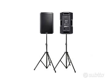 -coppia di casse attive Alto Professional TS315 da 2000 w l'una 2 × stativi piedistalli 2x custodie protettive alto professional Cover casse tenute in modo maniacale dati per singola cassa: Potenza di picco: 2000W Potenza RMS continua: 1000W Trasduttore basse: woofer 15” (381mm); voice coil da 3” (76 mm) Trasduttore alte: tweeter voice coil da 1,4” (35mm), magnete in neodimio Punto di Crossover: 2 kHz Risposta in frequenza: 50 Hz – 20 kHz (+/- 3 dB) Range coperto (+/-10dB): 43Hz – 22kHz Amplificatore: Classe D ad alta efficienza Raffreddamento passivo (senza ventole) Max dB-SPL @ 1 m: 134dB picco, 131dB continui Angolo di copertura (nominali): 90° H x 60° V Mixer a 2 canali integrato Ingressi (MIC/LINE): 2 Combo (Jack TRS 1/4” o XLR) Controllo di Volume per ogni ingresso (2) Circuiti di protezione: surriscaldamento, clip e saturazione trasduttori Indicatori: 2 LED (fronte e retro) per accensione e LED Clip limiter MIX OUT su connettore XLR maschio per link EQ: tasto “Contour” +3dB su basse e alte Cabinet trapezoidale in polipropilene Leggero e ottimizzato per differenti installazioni e il trasporto Griglia protettiva frontale in metallo perforato Installazione: foro da 36mm per stand, fori M10, palco e TSB810 Connettore di alimentazione: IEC con annesso fusibile Dimensioni e peso: 652x421x392mm; 18,8KG Progettato e calibrato negli USA