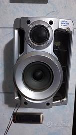 Coppia casse acustiche Panasonic modello SB-AK28 con subwoofer incorporato e doppio ingresso, impedenza: 6 ohm, potenza ingresso alte e medie frequenze: 60 W, potenza ingresso subwoofer: 140 W.