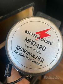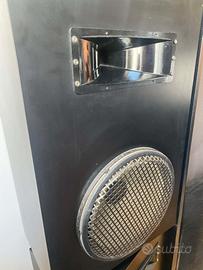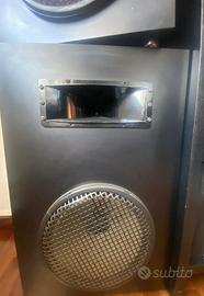 Artigianali anni '90, perfettamente funzionanti, hanno dimensioni di cm 69x45x28, peso 21,5 kg ciascuna, woofer da 25 cm di diametro e tweeter a tromba con lunghezza flangia di 27 cm. Non conosco marca e potenza del woofer, il tweeter è un Monacor MHD-120, per cui suppongo che ogni cassa abbia una potenza RMS di circa 100-120W (potenza musicale/picco 200-250W) su 8 Ohm.