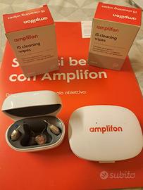 Coppia di apparecchi acustici Amplifon - Ampli Energy R 3 ricaricabili (NO batterie) con case per ricarica, custodia e kit di pulizia.