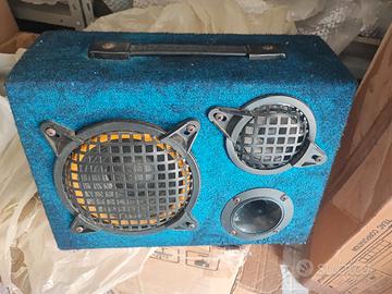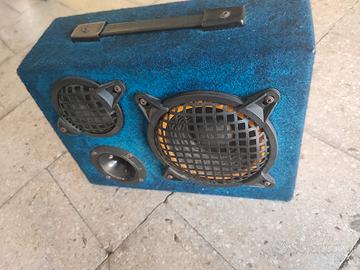 Vendo coppia di casse 3 vie passive, funzionanti per auto o per giardino o altro il tester mi dà tutte due più di 4 ohm, gli woofer sono da 16 cm, i medi da 10 cm. più tweeter, L'imbottitura esterna blu è un po' sbiadita scolorita.