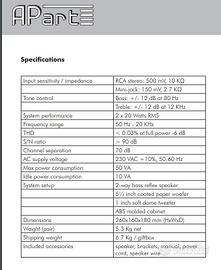 Woofer da 5,25" e tweeter da 1" in mylar. Amplificatore a bordo da 2 x 20WRMS, sensibilità 90dB 1w\1mt, 110dBSPL. Max risposta in frequenza 50-20KHz. Regolazione toni acuti e bassi e volume. Ingresso 2 x RCA o mini jack 3,5mm .Interruttore di rete , Led di stato, Led indicatore segnale e Clip . Misure 260 x 160 x 180mm ,complete di staffe e cavi Colore Nero usate ma perfettamente funzionanti. Peso 5,3Kg la coppia.