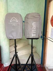 Coppia di casse Titan 12D da 300 watt l’una. Usate pochissimo praticamente cone nuove. Vendo per inutilizzo e do anche i cavalletti e le coperture per le casse come da foto. NO PERDITEMPO Prezzo non trattabile