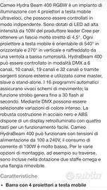 Vendo per inutilizzo coppia di teste mobili professionali cameo hydrabeam 400 rgbw ,paragonabili al nuovo in quanto sono state usate soltanto due volte .molto belle e potenti,adatte per service o dj in quanto sono piccole e pratiche ,si possono appoggiare,montare su americana o su stativo,volendo con 50€ in più cedo anche una coppia di stativi della proel .pagate 800€ svendo a 550€