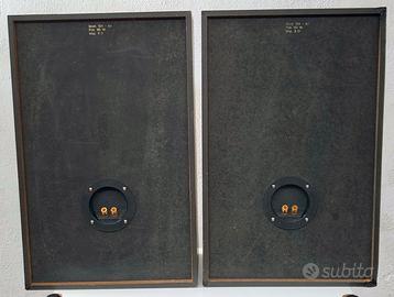 COPPIA DIFFUSORI HIFI 3 VIE - Coppia di diffusori per HiFi della storica marca BAUERS accuratamente riparati ed aggiornati da laboratorio specializzato; Woofer da 10" a lunga escursione montato in bass-reflex, doppio condotto con uscite svasate contro le turbolenze del flusso, Midrange da 4" ad ampia gamma montato in camera separata, Tweeter a cupola in seta trattata da 1" del tipo a bassa risonanza e 5 punti di fissaggio; filtro crossover realizzato con condensatori non polarizzati del tipo a bassa perdita in polietilene; morsettiera posteriore del tipo universale che accetta indifferentemente fili spellati, fili intestati con forchette o le banane standard da 4 mm; il mobile ha dimensioni 53x34x25 HxLxP finitura con venature tipo legno, presenta qualche segno del tempo passato come si vede dalle foto.
