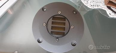 Al VGP2023 SUMMER, uno dei più grandi premi audiovisivi in Giappone, il T360FD ha ricevuto il Planning Award per la progettazione di un tweeter che impiega il metodo Folded Diaphragm, che eccelle nella formazione di un'immagine sonora. Lo stato acustico del "diaframma ripiegato", diverso da cono, tromba, cupola o RP, apre nuove porte alla riproduzione musicale. Il diaframma ripiegato eccelle nel creare un'immagine sonora ad alta densità con una presenza potente, e la sua espressione nella musica rock e metal è notevole. Il limite inferiore di frequenza operativa è di circa 2,5 kHz, che non è affatto basso, ma ha un'ampia larghezza di banda di riproduzione che può essere combinata con woofer da 10 cm e 16 cm, così come con altoparlanti full range da 16 cm e 20 cm. Il circuito magnetico e l'alloggiamento che supporta il diaframma sono progettati tenendo attentamente in considerazione non solo la forma e le dimensioni, ma anche i materiali utilizzati, con particolare attenzione alle condizioni acustiche del prodotto finito, nonché alle caratteristiche di frequenza e ad altri standard. Per dimostrare appieno le prestazioni acustiche, i terminali di ingresso sono dotati di terminali placcati in oro (#205 t0.8). È incluso anche un cavo (filo con anima SFC103) crimpato con terminali di fissaggio placcati in oro (#205 t0.8) per il collegamento. Il diaframma ripiegato è realizzato in materiale di base PI con strutture in alluminio corrispondenti agli avvolgimenti della bobina mobile; le strutture sono disposte in modo tale che, quando il diaframma viene ripiegato regolarmente, la corrente fluisca in direzioni opposte rispetto alle superfici verticali che si affacciano l'una sull'altra. Il principio di generazione del suono è che le superfici verticali opposte del diaframma si muovono in direzioni opposte quando sottoposte a flusso magnetico, e le onde sonore vengono emesse quando l'aria tra le superfici verticali viene spinta o tirata nello spazio tra di esse.