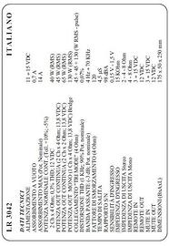 AUDISON LR3042 ALIMENTAZIONE 11 ÷ 15 VDC ASSORBIMENTO MAX (Pot. Nominale) 14Ah POTENZA NOMINALE CONT. 2 Ch x 4 Ohm 12 VDC 40 W RMS POTENZA OUT CONTINUA 2 Ch x 4 Ohm 13,8 VDC 45 W RMS POTENZA OUT CONTINUA 2 Ch x 2 Ohm 13,8 VDC 65 W RMS POTENZA OUT 1 Ch x 4 Ohm 13,8 VDC Bridge 130 W RMS BANDA PASSANTE 4Hz ÷ 100KHz SENSIBILITA' D'INGRESSO 0,15V ÷ 1,5VRMS DIMENSIONI 175 x 50 x 250 mm