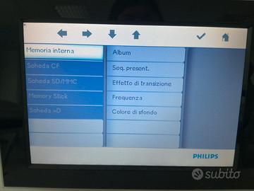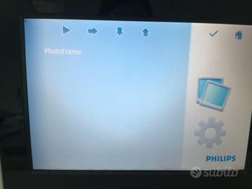 Cornice digitale Philips, LCD da 17,8 cm (7") Area visual. di 16,5 cm (6,5"), display a colori ad accensione e spegnimento automatici a orari preimpostati, riproduzione casuale, sequenziale e effetto transizione di presentazioni, singole foto, miniature e visualizzazione dell'orario. USB Verso PC/Mac (USB 2.0), formato foto supportato: Foto JPEG, File JPEG fino a 10 MB,fino a 13 megapixel – 7 Pulsanti, Lettore di schede Incorporato (2x), Modifica foto, Copia, Elimina, Ruota, Effetti fotografici bianco e nero, Posizionamento orizzontale e verticale, Funzione di configurazione: Sveglia, accensione/spegnimento automatico, segnale acustico on/off, regolazione luminosità, attivazione/disattivazione display orologio, lingua, impostazione ora e data.