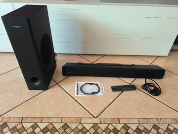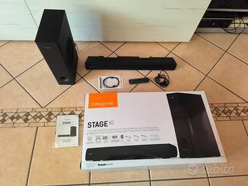 Soundbar Creative Stage V2 2.1 160W con subwoofer, Clear Dialog e Surround di Sound Blaster, Bluetooth 5.0, TV ARC, ingresso ottico e audio USB, con montaggio a parete, bassi e alti regolabili, per TV. Usato come nuovo in perfette condizioni estetiche e fuzionali, vendo lo per passaggio a sistema HT 5.1.