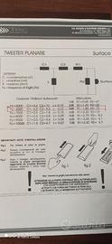 Componenti " Nuovi " taglio frequenza Fc= 6000Hz ( opzione per incrocio con midrange Tec Surface oppure altro a cupola ecc. ) come da scheda tecnica. Crossover Jentzen MkP in polipropilene, induttanza avvolta in aria su rocchetto spessore 1 mm resistenza Mox 10 W in serie e ceramica 10 W in parallelo attenuazione 3db