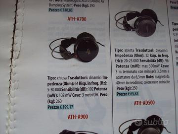 Cuffia dinamica Audio Technica ATH A700 in buone condizioni generali, con imballo originale, 3 metri di cavo telato, doppio jack piccolo e grande, 64 Ohms. Presenta normali segni di usura nei padiglioni interni ed esternamente è pressoché perfetta. Ottima da indossare per via del sistema brevettato degli archetti che scaricano molto bene tutto e offrono una sospensione ottima in testa. Solo ritiro a mano con prova.