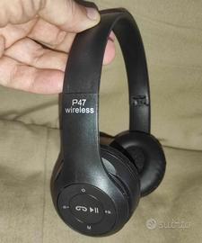 Cuffie wireless, ricaricabili, portatili e leggere. Modello P47. Puoi ascoltare la musica e rispondere alle chiamate. Pulsante regola volume e selezione traccia precedente o successiva. Tecnologia di riduzione del rumore per un suono migliore. Pieghevoli per adattarsi ovunque senza fili. Tempo di funzionamento: 6 ore. Ambito di lavoro: 10 metri. Cavo di ricarica USB: ingresso CA 110-240 V CC ingresso 5 V. In scatola originale con istruzioni per l'uso.