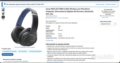 Vendo cuffie Sony ZX770BN in ottime condizioni, acquistate su amazon nel marzo 2017. Usate sempre con molta attenzione e mai all'aperto o in viaggio, sempre al pc di casa. La cancellazione del rumore è davvero ottima, e le cuffie sono leggere e confortevoli.