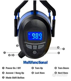Riduzione del rumore di 29 dB. Funzione 4 in 1: Bluetooth, MP3, radio FM e protezione dell'udito. Bluetooth digitale integrato e cavo stereo standard per telefono, lettore MP3 e vivavoce. Il display LCD consente di visualizzare facilmente lo stato del Bluetooth, della frequenza FM e della musica. Non è solo una protezione per l'udito, ma può anche portare molto più divertimento durante il lavoro. Una carica completa può garantire un utilizzo di 30 ore.