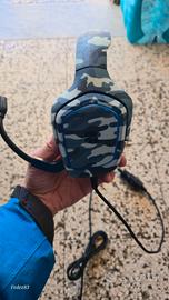 Vendo cuffie gaming cablate con design camouflage blu, complete di microfono integrato e comandi sul cavo.