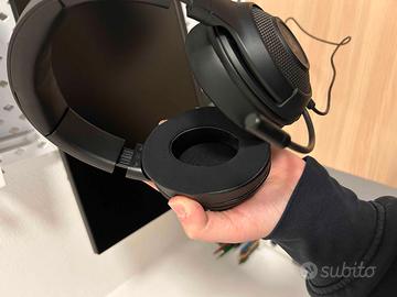 Cuffie gaming Razer Kraken X, leggere e multipiattaforma, con collegamento cablato tramite jack audio da 3,5 mm. Driver da 40 mm con supporto audio surround 7.1 su PC, pensate per gaming su PC e console con buon dettaglio direzionale. Archetto leggero con imbottitura e padiglioni over‑ear in memory foam per maggiore comfort nelle sessioni prolungate. Microfono flessibile unidirezionale per comunicazioni chiare in chat vocale. Stato pari al nuovo con padiglioni e archetto sostituiti con nuovi. Vendute con scatola originale. Bundle Razer - 200€ - Tastiera gaming Razer Huntsman Full Size - Mouse gaming Razer Mamba Elite - Cuffie gaming Razer Kraken X - Tappetino gaming Razer Goliathus Extended Chroma - Stand Razer Chroma per cuffie con hub USB 3 porte Tutti questi prodotti sono anche annunci singoli sul mio profilo.