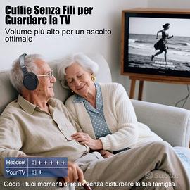 Cuffie TV Senza Fili con Base Trasmettitore di Ricarica, Cuffie Wireless per TV, Pulsanti Grandi e Amplificazione del Suono per Anziani, 20H di Autonomia, Cuffie Bluetooth Leggere e Confortevoli NUOVO MAI USATO LISTINO 90€ Esperienza Televisiva Coinvolgente: Queste cuffie wireless sono progettate specificamente per la visione della TV e supportano la trasmissione wireless RF a 2,4 GHz (audio TV a latenza zero) e la funzionalità dual-mode Bluetooth 5.3 (connessione a smartphone/tablet). La trasmissione stabile a lungo raggio fino a 30 metri, la forte capacità di penetrazione delle pareti e l'ampia copertura del segnale garantiscono una connessione stabile anche in scenari multi-room come soggiorni e camere da letto. La qualità del suono cristallina consente agli utenti di godersi facilmente programmi TV, opere e notiziari senza disturbare gli altri. Nessun Ritardo Nella Sincronizzazione Labiale: Le cuffie TV wireless basate sulla tecnologia RF a 2,4 GHz offrono un'esperienza audio e video perfettamente sincronizzata. Latenza ultra bassa, ideale per scenari che richiedono una risposta in tempo reale, come la visione di film ed eventi sportivi in diretta. Che si tratti delle urla del pubblico o delle grida dei giocatori, potrai vivere ogni momento emozionante in tempo reale. Queste cuffie wireless sono compatibili sia con connessioni TV ottiche digitali che analogiche, consentendoti di goderti la TV e i film con un suono di alta qualità. Audio Wireless Hi-Fi Chiaro: Le cuffie TV adottano 3 modalità EQ che regolano il volume delle diverse bande di frequenza per migliorare la qualità del suono. È possibile scegliere tra modalità preimpostate in base alle preferenze personali o al genere musicale: Voice Clarifying (chiarezza della voce e miglioramento vocale), Full (ricchezza e miglioramento dei bassi/acuti) e Normal (standard, uso generico). Compatibile con la maggior parte dei televisori e dei servizi di streaming come Netflix. È sufficiente collegare il cavo di alim