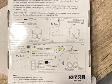CONFEZIONE DELLE CUFFIE - La confezione include le cuffie TV, il trasmettitore USB, il cavo ottico, il cavo coassiale, il cavo da 3,5 mm, il cavo RCA, il digitalizzatore, il cavo di ricarica e il manuale d'uso in italiano/inglese (senza adattatore di ricarica).