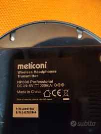 Cuffie wireless Meliconi HP300 Professional. La base di ricarica prende il segnale audio da una sorgente tramite jack stereo e lo invia alle cuffie. No scatola no istruzioni d'uso (comunque reperibili facilmente su internet). Vendo a mano Roma Prati e quartieri limitrofi.