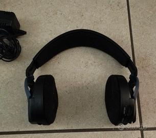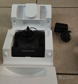 Cuffie wireless Sennheiser RS 45. Il tessuto delle cuffie è abbastanza usato ma il suono è ancora buono. Una batteria inclusa. La base funziona sia da antenna che da caricatore per le batterie.
