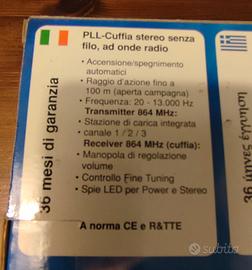 Range di funzionamento 100 metri in campo aperto, frequenza 20 - 13000 Hz, controllo del volume, led che indica la carica e stereo
