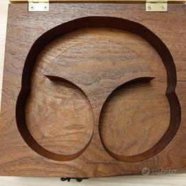 custodia per cuffie, in questo caso realizzata per cuffie serie Jbl ma adattabile a tanti altri brand come sony akg ecc. La parte sottostante è in legno massello di noce e scavo ricavato con fresatura, parte superiore realizzato in legno di Tiglio nella cornice e legno di noce per il tappo interno senza ausilio di viti ma eseguito con tecnica ad incastro, cerniere spessorate in ottone e gancio di chiusura a baionetta, finitura ad olio.