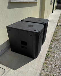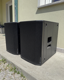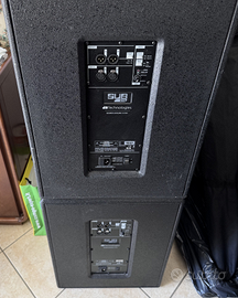 Vendo causa inutilizzo per passaggio a categoria superiore, hanno alle spalle non più di 5/6 serate. Condizioni pari al nuovo, con qualche leggerissimo segno dovuto al trasporto. Consegna a mano con prova d'utilizzo. Specifiche tecniche: 1 subwoofer bass reflex da 15 pollici Potenza: 600 W RMS, 1200 W di picco (Classe D digipack) Range di frequenza: 42 - 142 Hz Livello massimo: 131 dB 2 ingressi XLR + 2 uscite XLR DSP a 56 bit con 2 preset Crossover stereo Limiter dinamico Flangia di supporto M20 Dimensioni: 430 x 580 x 600 mm Peso: 25,5 kg