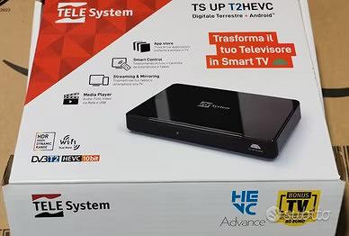 Trasforma il tuo vecchio televisore in uno Smart TV con TS UP T2HEVC!Lo Smart Box TS UP è pronto a ricevere i nuovi canali digitali terrestri DVB-T2 HEVC 10 bit, ma anche i migliori servizi di streaming disponibili su Android™ 9 AOSP. I film e le Serie TV del momento, l’intrattenimento ed il grande sport saranno sempre disponibili online, in diretta o in modalità on demand, grazie alle app scaricabili gratuitamente. Puoi controllare TS UP con il telecomando in dotazione ma, effettuando l’accoppiamento con smartphone o tablet, sbloccherai tantissime funzioni avanzate: la riproduzione dei contenuti multimediali da un dispositivo mobile sullo schermo del TV, il controllo diretto di tutte le app di TS UP T2HEVC direttamente da tablet, il mirroring dello schermo e della videocamera dello smartphone, il mouse... scopri queste ed altre funzioni installando l’app gratuita EShare disponibile per iOS e Android. Descrizione Prodotto Ricevitore - Ricevitore con tecnologia digitale - Con HDTV - Con sintonizzatore DVB-T - Con HDMI - Con connessione di rete Ethernet - Con W-LAN - RAM 1 GB SDRAM DDR3 - Flash 8 GB eMMC - WiFi dual band 2T2R (802.11ac/a/b/g/n, 2.4/5 GHz) - Bluetooth® v 5.0 - Tuner Digitale Terrestre DVB-T/T2 HEVC 10bit - Televideo - Auto-spegnimento dopo 3 ore - Liste canali favoriti 10 liste