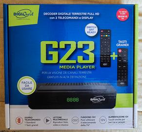 Decoder DTT DigiQuest G23. Con doppio telecomando. Usato solo un paio di settimane e perfettamente funzionante. Porta USB per Media Player (filmati, musica, immagini).
