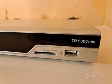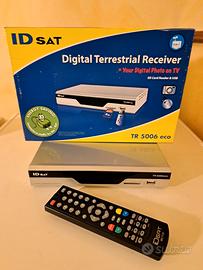 Decoder Digitale Terrestre ID SAT modello TR 5600 ECO, in ottimo stato, con telecomando e confezione originale. Il dispositivo è dotato di due connessioni scart, uno slot per SD Card e una presa USB per ascoltare musica o vedere foto sul televisore.