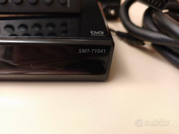 Decoder digitale terrestre Samsung SMT-T1041. - Telecomando incluso. - Cavo SCART e antenna inclusi - Alimentatore incluso. ATTENZIONE, questo decoder riceve canali solo in DVB-T, prima "versione" di digitale terrestre (e non DVB-T2 HEVC).