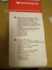 DDT Shinelco DTDS2 - Decoder digitale terrestre T1 - Tipo da posizionare a scomparsa, direttamente sulla presa scart posteriore del tv - NUOVO, mai usato, solo testato - Completo di telecomando e imballo.