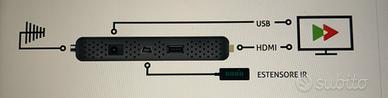 1 x DPT210HA STICK TV - 1 x Telecomando - 1 x Mini cavo flessibile adattatore HDMI Maschio/Femmina - 1 x Estensore IR con display per la visualizzazione del canale sintonizzato - 1 x Cavo alimentazione plug/USB per collegamento alla presa USB della TV alimentatore non incluso - 1 x Manuale d'uso Italiano