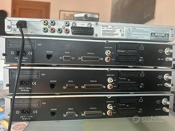 📝 Descrizione: vendo 3 decoder philips. Uno di questi non si accende (come mostrato in foto ma può essere utile per pezzi di ricambio per il modello funzionante. Il lettore dvd si accende e il cassetto cd si apre correttamente. Presenti i telecomandi, cavi di alimentazione e prese scart per collegarli a tv