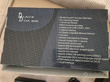 Decoder satellitare Linux clone Dreambox, mod. Black Box 500, perfettamente funzionante, provvisto di lettore di smartcard, nella foto del pannello posteriore potete verificare le connessioni presenti. Completo di alimentatore e telecomando.