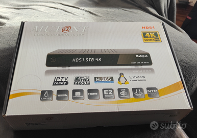 Vendo decoder Mutant HD51, risoluzione 4K, tuner satellitare DVB-S2 e digitale terrestre DVB-T2/C, codec H.265, sistema operativo Linux-Enigma 2