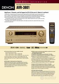 Capacità di Decodifica Dolby Digital/AC-3, Dolby Pro Logic (con Dynamic Discrete Surround Circuit-Digital) DTS, e DTS ES Discreto. Processore SHARC 32-bit. Convertitore D/A audio a 24 bit/96 kHz. Ingressi video: 5 S-Video, 5 composite e 2 component. Uscite video: 3 S-Video; 3 composite e 1 component. Ingresso multicanale 7.1. Sintonizzatore AM/FM stereo, sistema RDS, 40 memorie. Completo di Telecomando originale multifunzione in dotazione. Multi-Room per l’ascolto anche in una stanza secondaria.