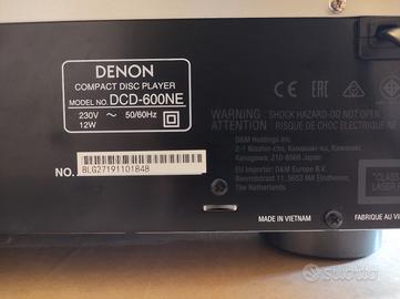 Vendo, per passaggio a sistema Daphile + dac, il mio lettore Denon DCD 600ne, completo di imballo originale, telecomando e accessori. Questo modello è probabilmente il miglior lettore cd entry level: nonostante il prezzo contenuto ha alimentazione lineare, dac a 32 bit Burr Brown (Texas instruments), algoritmo proprietario di upsampling AL32 processing, condensatori Elna nella sezione analogica e meccanica condivisa con lettori dal costo superiore come Rotel e Marantz (riconoscibile dal supporto del clamp a nido d'ape). L'apparecchio funziona perfettamente ed è in ottime condizioni, ma per correttezza segnalo due piccoli difetti estetici: sul pulsante open/close è presente un puntino in cui è saltata la vernice (visibile in una foto) e sul fianco destro è presente un graffio superficiale di circa 1,5cm, visibile solo in particolari condizioni di luce. Mai esposto a fumo. Data la delicatezza dell'oggetto e l'ingombro dell'imballo non effettuo spedizione. Preferisco la consegna a mano presso la mia abitazione. In questo modo l'acquirente avrà modo di visionare l'oggetto e fare una prova di ascolto e funzionamento.