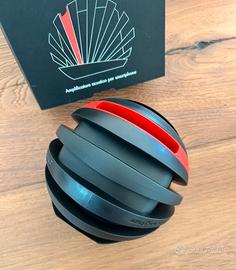 Diffusore acustico per smartphone in zantech, compound tecnico a base di “g upgraded recycled graphite”. dionisio è composto di 3 moduli assemblati senza utilizzo di collanti. È progettato per alloggiare smartphone fino a 13 mm di spessore e 84 mm di larghezza